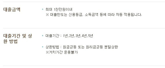 대출금액 한도는 최고 300만원 이내 까지되구요 상환방법은 일시상환 및 통장자동대출로 기본1년이지만 연장으로 5년도 가능합니다